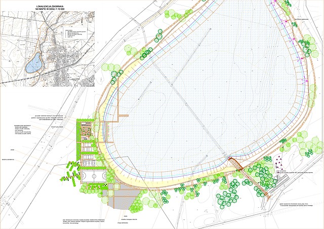 Poniżej prezentujemy mapę z projektowanym zbiornikiem wraz z koncepcją strefy rekreacyjno-sportowej oraz wstępny podział działek dla miejscowego planu zagospodarowania przestrzennego, a także przebieg dwóch kluczowych dróg zaplanowanych w strategii miasta, służące skomunikowaniu zbiornika.